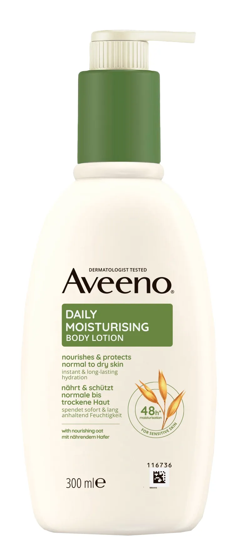 Formulė su maitinančiomis avižomis ir turtingomis minkštinamosiomis medžiagomis. Padeda sustiprinti natūralų odos drėgmės barjerą ir apsaugoti odą nuo išorinių dirgiklių ar vandens praradimo. Kliniškai įrodyta, kad tinka sausai, jautriai odai. Neriebus. Greitai įsigeriantis. Aveeno koloidinės avižos yra 100 % tyros, be GMO ir tikslingai parūgštintos. Prebiotinės koloidinės avižos padeda palaikyti sveikų odos mikroorganizmų augimą ir skatina pieno rūgšties, natūralaus drėgmės faktoriaus, gamybą.