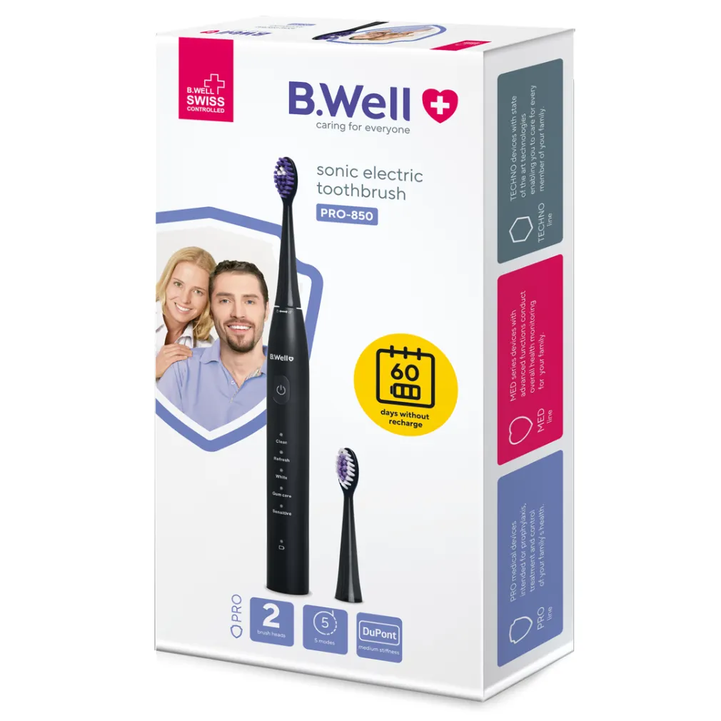 Elektrinis "Sonic" dantų šepetėlis B.Well PRO-850 skirtas efektyviam ir švelniam dantų, tarpdančių valymui ir dantenų masažui. "Sonic" vibracinė technologija leidžia valyti danties paviršių net ir sunkiausiai pasiekiamose vietose, o kokybiški Dupont šereliai yra saugūs emaliui ir dantenoms. Penki darbo režimai padeda reguliuoti vibruojančios galvutės intensyvumą ir rasti tobulą dantų valymo režimą. PRO-850 sonic dantų šepetėlis yra saugus plomboms, tiltams, implantams, karūnėlėms ir breketams. Dantų šepetėlyje yra 2 keičiamos šepetėlio galvutės, kad būtų lengva pakeisti ir nuolat prižiūrėti dantis. Dantų šepetėlyje yra įmontuotas išmanusis laikmatis, veikiantis 2 minutes ir 30 sekundžių. 30 sekundžių laikmatis signalizuoja, kai reikia pakeisti dantų valymo vietą, o įtaisytas 2 minučių laikmatis padeda laikytis odontologo rekomenduojamos 2 minučių rutinos. Viena įkraunama baterija be įkrovimo veikia mažiausiai 60 dienų. Dėl USB jungties dantų šepetėlį galima įkrauti ne tik iš elektros tinklo, bet ir iš maitinimo banko, nešiojamojo ar kompiuterio. Vibracijos dažnis iki 39600 vpm išvalo iki 100% apnašų 5 režimai: Clean – kasdienis valymas Refresh – švelnus valymas White – gilus valymas ir balinimas Gum care – dantenų masažas Sensitive – jautriems dantims Išmanusis laikmatis: 30 sekundžių ir 2 minučių laikmatis padeda laikytis odontologo rekomenduojamos dantų valymo tvarkos 60 dienų be įkrovimo Patogu dviem naudotojams: 2 šepetėlių galvutės su skirtingų spalvų šereliais, kad būtų patogu dviem naudotojams DuPont Premium šereliai: vidutinio standumo DuPont šereliai emaliui ir dantenoms apsaugoti Patogus vandeniui atsparus maišelis ir higieniškas apsauginis dangtelis šepetėlių galvutėms