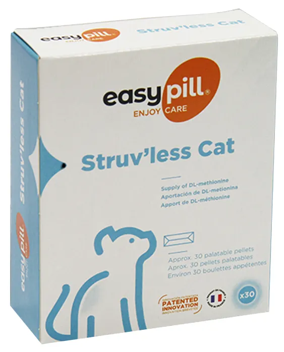 Skanios „EasyPill Struv’Less“ pastilės katėms padeda parūgštinti šlapimą dėl pridėto DL-metionino. Jos taip pat yra spanguolių, kurios yra proantocianidinų šaltinis, ir gliukozamino, kuris yra glikozaminoglikanų (GAG) pagrindinė sudedamoji dalis, bei L-triptofano. Visos šios medžiagos kartu gerina šlapimo pūslės gleivinės kokybę. „EasyPill“ koncepcija leidžia jas vartoti kaip tikrą skanėstą, nes jos yra minkštos, kramtomos ir turi unikalų skonį, kurį katės labai mėgsta. Vienoje tabletėje yra 400 mg DL-metionino, kurio pakanka, kad katės šlapimas taptų rūgštus ir skatintų struvito akmenų tirpimą per 2–5 savaites. Spanguolės yra turtingos proantocianidinų (PAC), kurie neleidžia E. coli bakterijoms prilipti prie šlapimo pūslės vidinio sluoksnio. 1 tabletė yra 10 mg PAC. Gliukozaminas yra glikozaminoglikanų, kurie padeda išlaikyti šlapimo pūslės vidinio sluoksnio vientisumą, pirmtakas. Kiekvienoje pastilėje yra 40 mg gliukozamino sulfato.L-triptofano atpalaiduojantis poveikis: triptofanas yra serotonino pirmtakas, kuris padeda sumažinti nerimą, nes stresas gali prisidėti prie šlapimo pūslės problemų katėms.