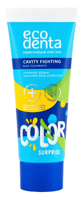 Spalva siurprizas*! Vienoje tūbelėje - geltonos, žalios arba mėlynos spalvos dantų pasta, kuri dantų valymą paverčia smagiu nuotykiu. Ypač gaivaus melionų skonio pasta efektyviai valo dantis ir apsaugo emalį. Ši dantų pasta jūsų vaikų dantis apsaugo nuo apnašų ir ėduonies. Sudėtyje yra natrio fluorido. Vaikams iki 6 m. naudokite žirnio dydžio kiekį, stebėkite, kad nenurytų. Jeigu vartojami produktai, kurių sudėtyje yra fluorido, pasitarkite su odontologu arba savo gydytoju. *Spalva siurprizas – kas kartą perkant naują šio produkto pakuotę yra galimybė rasti vis kitos spalvos dantų pastą (geltoną, žalią arba mėlyną). Spalvos kinta per skirtingas produkto gamybines partijas. Vienoje tūbelėje - viena spalva.