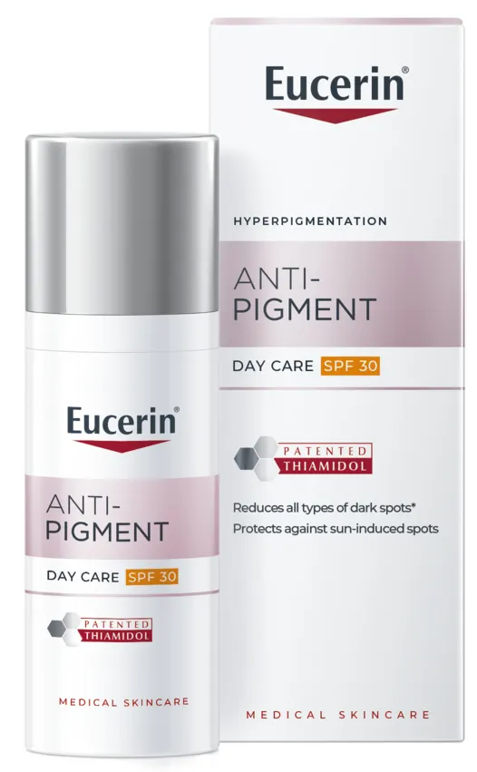 Drėkinamasis dieninis kremas su UVA ir UVB apsauga padeda blukinti pigmentines dėmes, suteikia odai lygumo ir skaistumo. Melaninas – tai natūralus, odai spalvą suteikiantis pigmentas. Saulės šviesos poveikis, hormoniniai pokyčiai ir senėjimo procesai gali lemti padidėjusią melanino gamybą ir sukelti hiperpigmentaciją. Hiperpigmentacija pasireiškia tamsiomis dėmėmis, taip pat dėl amžiaus atsiradusiomis pigmentinėmis dėmėmis (dar vadinamomis saulės ar senatvinėmis dėmėmis), dėl kurių odos spalva atrodo netolygi. Dieninio kremo „Eucerin® Anti-Pigment“ su SPF 30 sudėtyje yra tiamidolio – efektyvios veikliosios medžiagos, kuri mažina melanino gamybą – pagrindinę hiperpigmentacijos atsiradimo priežastį. Klinikiniais ir dermatologiniais tyrimais patvirtinta, kad šis kremas blukina pigmentines dėmes ir apsaugo nuo pakartotinio jų atsiradimo. Pirmieji rezultatai pastebimi po dviejų savaičių ir naudojant reguliariai nuolat gerėja. Su UVA ir UVB filtrais (SPF 30) gaminamas drėkinamasis dieninis kremas suteikia efektyvią apsaugą nuo saulės ir sumažina saulės sukeliamų pigmentinių dėmių atsiradimo tikimybę. Geriausiems rezultatams pasiekti naudokite kartu su kitomis „Eucerin® Anti-Pigment“ linijos priemonėmis.