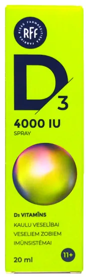 D3 4000 IU SPRAY D3 vitaminas. IU SPRAY – patogus purškiamas D3 vitamino papildas, sukurtas palaikyti kaulų, dantų ir imuninės sistemos sveikatą. Šis lengvai vartojamas purškiklis skirtas paaugliams nuo 11 metų ir suaugusiems, norintiems užtikrinti optimalų D vitamino kiekį organizme.Kaulų ir dantų sveikatai: • D3 vitaminas padeda palaikyti normalią kalcio ir fosforo apykaitą, reikalingą kaulų ir dantų stiprumui. • Prisideda prie kalcio lygio kraujyje palaikymo, kuris būtinas tinkamai kaulų mineralizacijai.Imuninės sistemos palaikymui: • D3 vitaminas būtinas normaliai imuninės sistemos veiklai, padeda organizmui apsisaugoti nuo virusų ir bakterijų. • Svarbus ląstelių dalijimosi procesams, todėl prisideda prie bendros organizmo sveikatos ir atsparumo ligoms.Raumenų funkcijai: • Padeda palaikyti normalų raumenų tonusą ir funkcionalumą, todėl ypač svarbus fiziškai aktyviems žmonėms. Ši purškiama forma leidžia greitai ir efektyviai pasisavinti D3 vitaminą per burnos gleivinę, užtikrinant optimalų poveikį. Gamintojas: AS „Rīgas farmaceitiskā fabrika“, Ozolu iela 10, Rīga, LV-1005, Latvija. D3 vitamino kilmės šalis: Šveicarija.