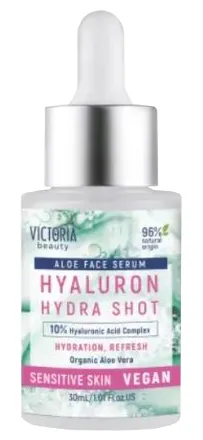 Drėkinamasis ir raminamasis veido serumas.Sudėtyje yra 10 % hialurono rūgšties komplekso.Praturtintas alavijo lapų sultimis ir niacinamidu.Drėkina, gaivina, ramina ir suteikia odai spindesio.96 % natūralios kilmės.Neišbandyta su gyvūnais. Veganiškas.Veido serumas iš „Victoria Beauty“ kosmetikos linijos „Hyaluron Hydra Shot“ drėkina, gaivina, ramina ir padeda odai spindėti. Jame yra 10 % hialurono rūgšties komplekso, kuris pasižymi stipriomis drėkinamosiomis savybėmis, bei alavijo sulčių ir niacinamido, kurie padeda nuraminti ir skaistinti odą.Serumas yra 96 % natūralios kilmės, nebandytas su gyvūnais ir tinka veganams.